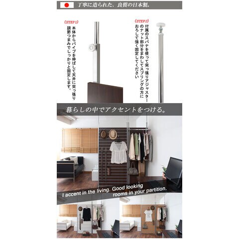 | 突っ張りシリーズにクローゼットハンガーが新登場。収納と間仕切りを組み合わせて、貴方だけのスペースが出来上がる。クローゼットハンガーだけを横並びにセットすればウォークインクローゼットが簡単にできます。またミラータイプやマガジンディスプレイタイプなどシリーズで組み合わせれば本格間仕切り部屋が完成します。ドアカーテンをセットすれば入り口も出来上がり。2サイズ3カラー展開でお部屋に合わせて選べます。 |