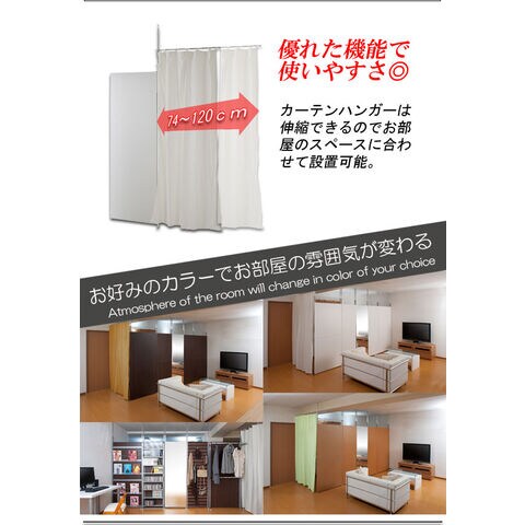 | 殺風景なお部屋が間仕切りパーテーションに専用カーテンを セットすると、ひとつのお部屋が完成!開閉しやすいカーテンで ドアの役目になりお部屋が完成!カーテンハンガーは 伸縮できるのでお部屋のスペースに合わせて設置可能。 |