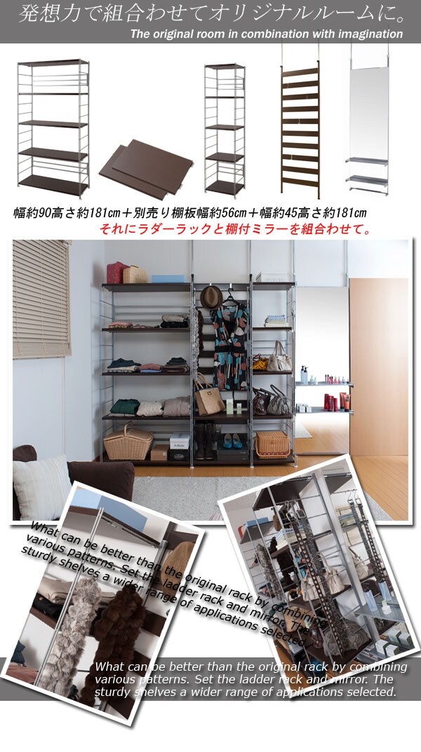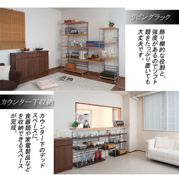 | 国産の上品質でシンプルなラック更に強度は抜群!棚板を繋いでテレビ台にもなる頑丈なスチールラックは棚板の構造が他とは違うんです。芯材には強度抜群の積層合板(LVL)を使用。更に横に貼り合わせるのではなく縦に貼り合わせて更なる強度をアップしました。通常5~10程の棚板の強度が約30の耐荷重を実現。2本のラックに別売り棚板を連結して、3本分の収納スペースを作ったり、通常の棚板は段違いになる物が多いですが、このラックは同じ高さに連結することができるので用途も広がります。リビングとして飾り棚的な役割と、強度があるのでソフト類をたっぷり置いても大丈夫です。カウンター下のデッドスペースに設置で食器類や家電製品などを収納できるスペースが完成。 |