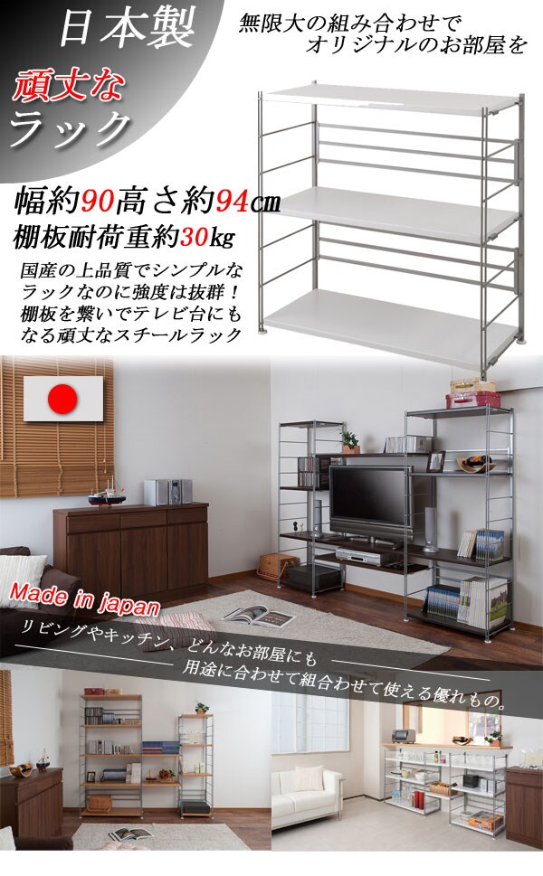 オープンラック 日本製 3段 幅90 高さ94 ステンレス 頑丈棚 三段 ホワイト 白 スチールラック シェルフ おしゃれ モノトーン 国産 北欧【送料無料】