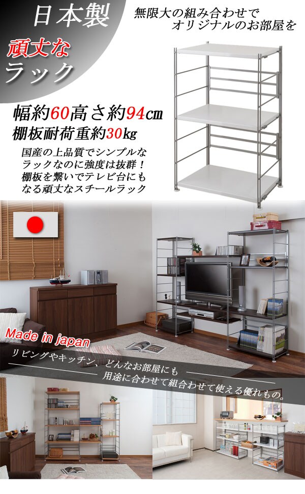 オープンラック 日本製 3段 幅60 高さ94 ステンレス 頑丈棚 三段 ナチュラル スチールラック シェルフ おしゃれ モノトーン 国産 北欧【送料無料】