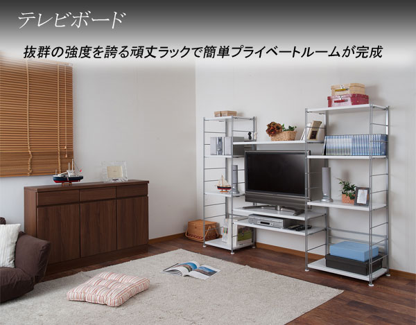 | 国産の上品質でシンプルなラック更に強度は抜群!棚板を繋いでテレビ台にもなる頑丈なスチールラックは棚板の構造が他とは違うんです。芯材には強度抜群の積層合板(LVL)を使用。更に横に貼り合わせるのではなく縦に貼り合わせて更なる強度をアップしました。通常5~10程の棚板の強度が約30の耐荷重を実現。2本のラックに別売り棚板を連結して、3本分の収納スペースを作ったり、通常の棚板は段違いになる物が多いですが、このラックは同じ高さに連結することができるので用途も広がります。リビングとして飾り棚的な役割と、強度があるのでソフト類をたっぷり置いても大丈夫です。カウンター下のデッドスペースに設置で食器類や家電製品などを収納できるスペースが完成。 |