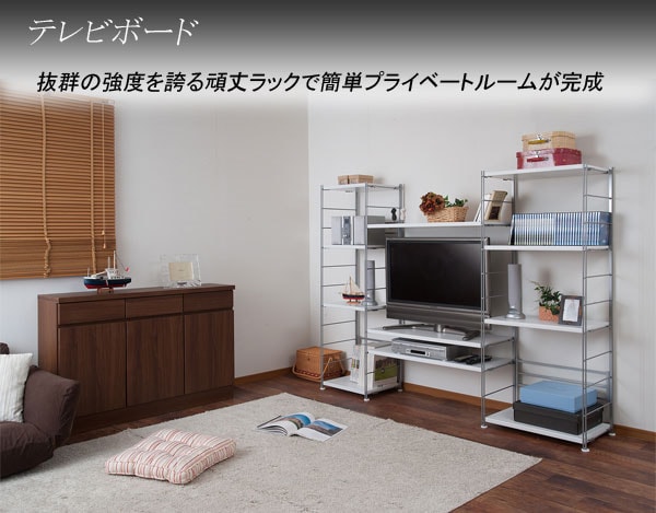 | 国産の上品質でシンプルなラック更に強度は抜群!棚板を繋いでテレビ台にもなる頑丈なスチールラックは棚板の構造が他とは違うんです。芯材には強度抜群の積層合板(LVL)を使用。更に横に貼り合わせるのではなく縦に貼り合わせて更なる強度をアップしました。通常5~10程の棚板の強度が約30の耐荷重を実現。2本のラックに別売り棚板を連結して、3本分の収納スペースを作ったり、通常の棚板は段違いになる物が多いですが、このラックは同じ高さに連結することができるので用途も広がります。リビングとして飾り棚的な役割と、強度があるのでソフト類をたっぷり置いても大丈夫です。カウンター下のデッドスペースに設置で食器類や家電製品などを収納できるスペースが完成。 |