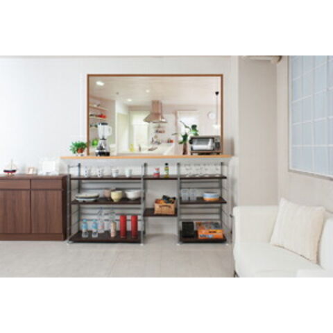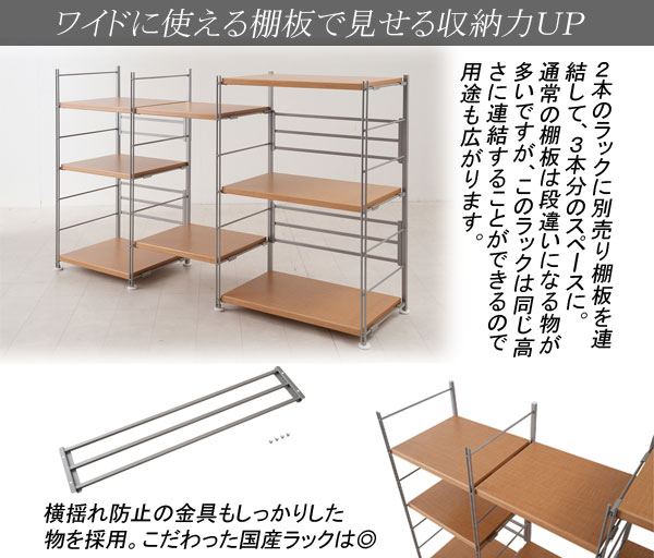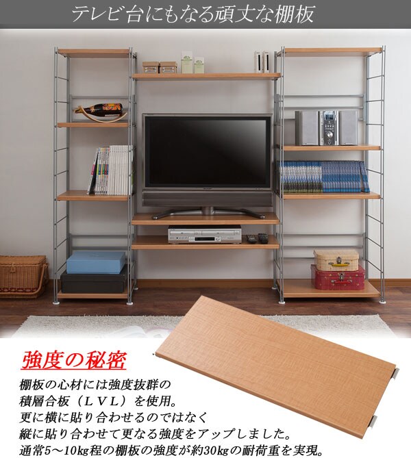 | 国産の上品質でシンプルなラック更に強度は抜群!棚板を繋いでテレビ台にもなる頑丈なスチールラックは棚板の構造が他とは違うんです。芯材には強度抜群の積層合板(LVL)を使用。更に横に貼り合わせるのではなく縦に貼り合わせて更なる強度をアップしました。通常5~10程の棚板の強度が約30の耐荷重を実現。2本のラックに別売り棚板を連結して、3本分の収納スペースを作ったり、通常の棚板は段違いになる物が多いですが、このラックは同じ高さに連結することができるので用途も広がります。リビングとして飾り棚的な役割と、強度があるのでソフト類をたっぷり置いても大丈夫です。カウンター下のデッドスペースに設置で食器類や家電製品などを収納できるスペースが完成。 |