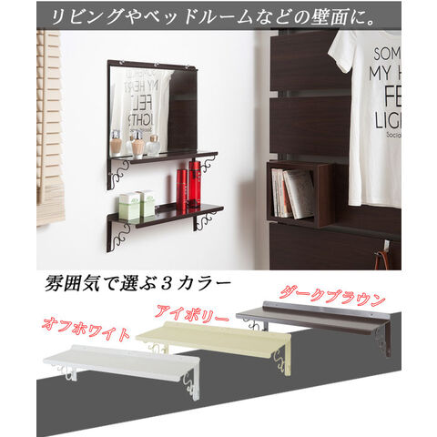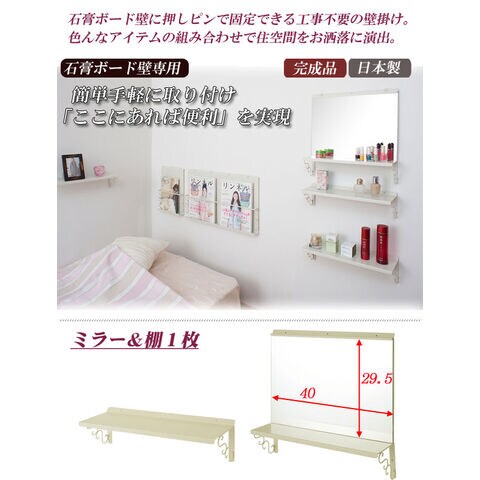 | 石膏ボード壁に押しピンで固定できる工事不要の壁掛け棚。色んなアイテムの組み合わせで住空間をお洒落に演出できます。好きな所に設置でき、また位置変えも簡単。壁には押しピン跡しか残らないので、修復も簡単!この便利な飾り棚と壁面にドレッサーが生まれるミラー付きがセットで新登場。カラーはオフホワイト・アイボリー・ダークブラウンの3色から。横に並べたり別のシーンで使用したりと使い方様々。他に棚板3枚組・雑誌をディスプレイできるマガジン収納タイプなどこれからは壁面をデザインする収納&ディスプレイに!破れたり汚くなった壁紙を目隠しできる効果もあります。 |