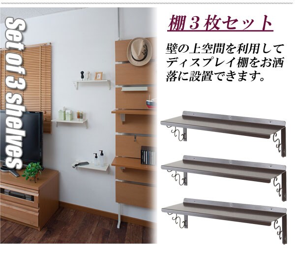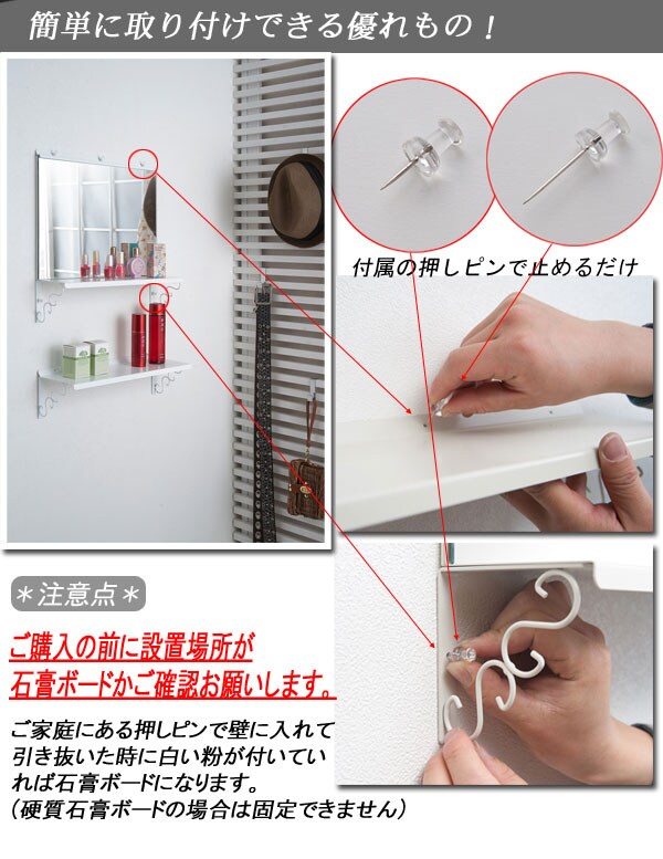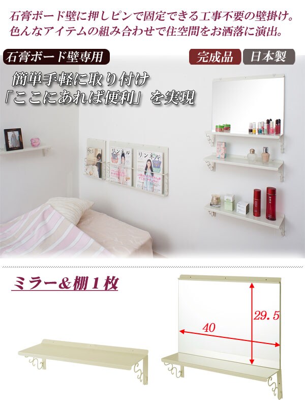 | 石膏ボード壁に押しピンで固定できる工事不要の壁掛け棚。色んなアイテムの組み合わせで住空間をお洒落に演出できます。好きな所に設置でき、また位置変えも簡単。壁には押しピン跡しか残らないので、修復も簡単!この便利な飾り棚と壁面にドレッサーが生まれるミラー付きがセットで新登場。カラーはオフホワイト・アイボリー・ダークブラウンの3色から。横に並べたり別のシーンで使用したりと使い方様々。他に棚板3枚組・雑誌をディスプレイできるマガジン収納タイプなどこれからは壁面をデザインする収納&ディスプレイに!破れたり汚くなった壁紙を目隠しできる効果もあります。 |