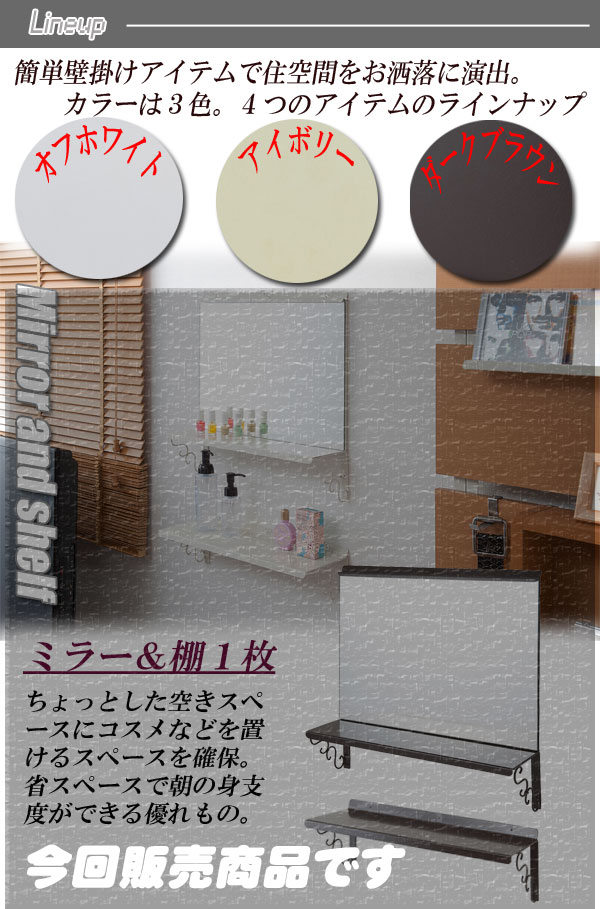 | ミラー付き:(約)幅40×奥行11×高さ42cm ミラー付きの棚板部:(約)幅40×奥行9.5cm 棚板:(約)幅40×奥行13(棚面12)×高さ12cm |