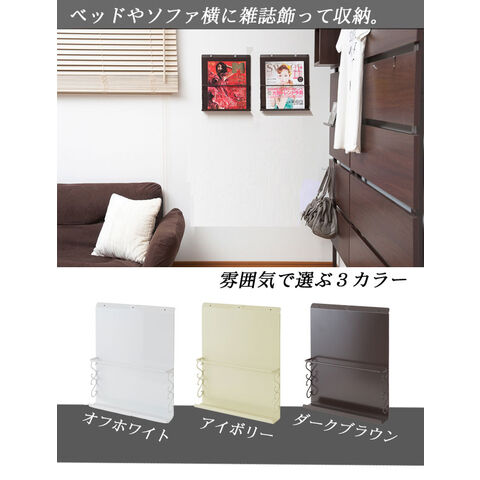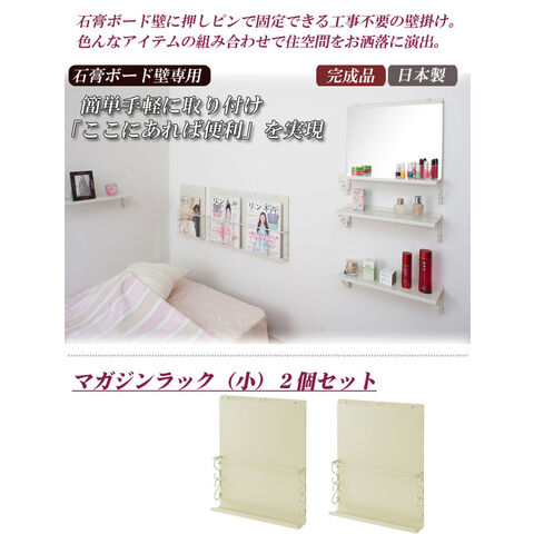 | 石膏ボード壁に押しピンで固定できる工事不要の壁掛け棚。色んなアイテムの組み合わせで住空間をお洒落に演出できます。好きな所に設置でき、また位置変えも簡単。壁には押しピン跡しか残らないので、修復も簡単!この便利なマガジン収納が2個組みで新登場。カラーはオフホワイト・アイボリー・ダークブラウンの3色から。横に並べたり別のシーンで使用したりと使い方様々。他に棚板3枚組・壁面にドレッサーが生まれるミラータイプなどこれからは壁面をデザインする収納&ディスプレイに!破れたり汚くなった壁紙を目隠しできる効果もあります。 |