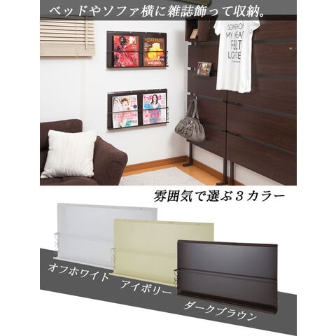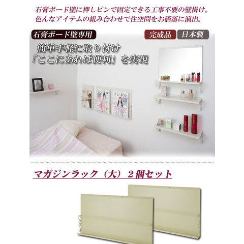 | 石膏ボード壁に押しピンで固定できる工事不要の壁掛け棚。色んなアイテムの組み合わせで住空間をお洒落に演出できます。好きな所に設置でき、また位置変えも簡単。壁には押しピン跡しか残らないので、修復も簡単!この便利なマガジン収納が2個組みで新登場。カラーはオフホワイト・アイボリー・ダークブラウンの3色から。横に並べたり別のシーンで使用したりと使い方様々。他に棚板3枚組・壁面にドレッサーが生まれるミラータイプなどこれからは壁面をデザインする収納&ディスプレイに!破れたり汚くなった壁紙を目隠しできる効果もあります。 |