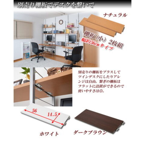 突っ張りシリーズにデスクタイプが新登場。使い易く便利なデスクとラックをセッティングして貴方のオリジナルスペースに変身!!別売り棚板で煩雑になりがちなデスク周りを賢く活用し更に収納力もアップ!デスク2セットに橋渡しすればオープンラックが完成!携帯電話やデスク周りの小物や、バッグや衣類に帽子など色んな物がチョイ掛けできるラダー式のフレームで、綺麗に格好良く収納できます。別売り棚板は小・大の2種から2枚組で新登場!