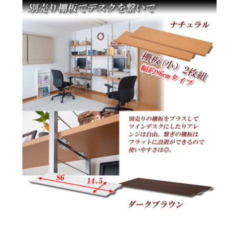 | 突っ張りシリーズにデスクタイプが新登場。使い易く便利なデスクとラックをセッティングして貴方のオリジナルスペースに変身!!別売り棚板で煩雑になりがちなデスク周りを賢く活用し更に収納力もアップ!デスク2セットに橋渡しすればオープンラックが完成!携帯電話やデスク周りの小物や、バッグや衣類に帽子など色んな物がチョイ掛けできるラダー式のフレームで、綺麗に格好良く収納できます。別売り棚板は小・大の2種から2枚組で新登場! |