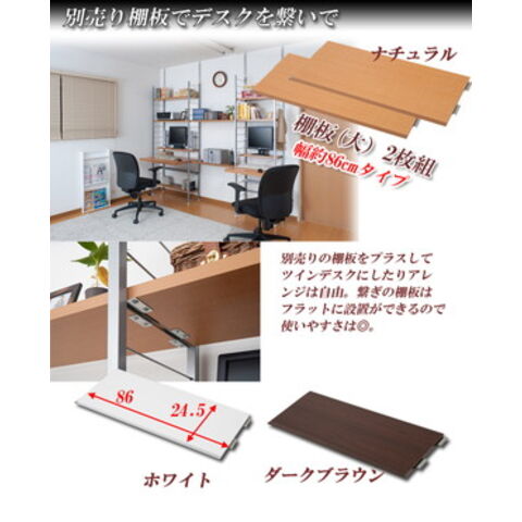 | 突っ張りシリーズにデスクタイプが新登場。使い易く便利なデスクとラックをセッティングして貴方のオリジナルスペースに変身!!別売り棚板で煩雑になりがちなデスク周りを賢く活用し更に収納力もアップ!デスク2セットに橋渡しすればオープンラックが完成!携帯電話やデスク周りの小物や、バッグや衣類に帽子など色んな物がチョイ掛けできるラダー式のフレームで、綺麗に格好良く収納できます。別売り棚板は小・大の2種から2枚組で新登場! |