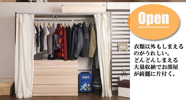 | 耐荷重量/ハンガーバー:約30kg 取外し可能なカーテン付きで既製カーテンに取替え可能 幅サイズは伸縮式で機能的 |