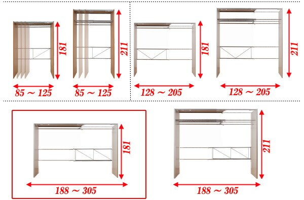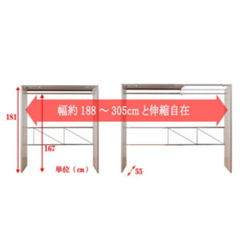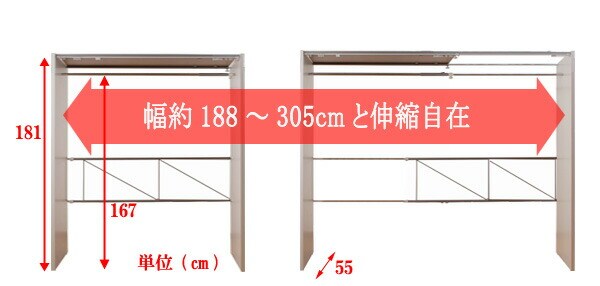 | 本体:(約)幅188~305×奥行55×高さ181cm ハンガー下高さ :(約)167cm |