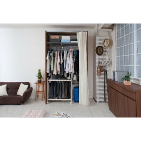 | 耐荷重量/ハンガーバー:約24kg、上棚:約10kg 取外し可能なカーテン付きで既製カーテンに取替え可能 幅サイズは伸縮式で機能的 |