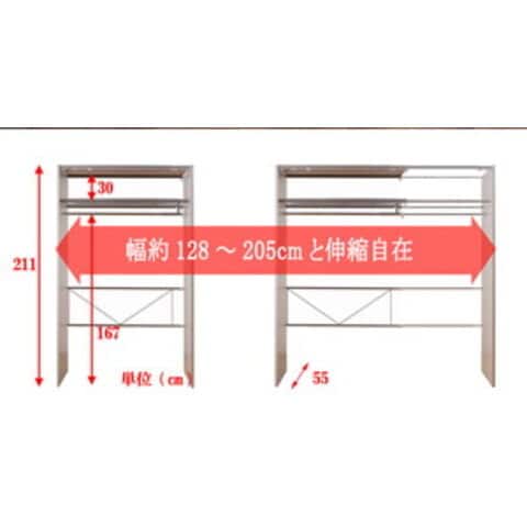 | 本体:(約)幅128~205×奥行55×高さ211cm ハンガー下高さ :(約)167cm 上棚内寸高さ:(約)30cm |