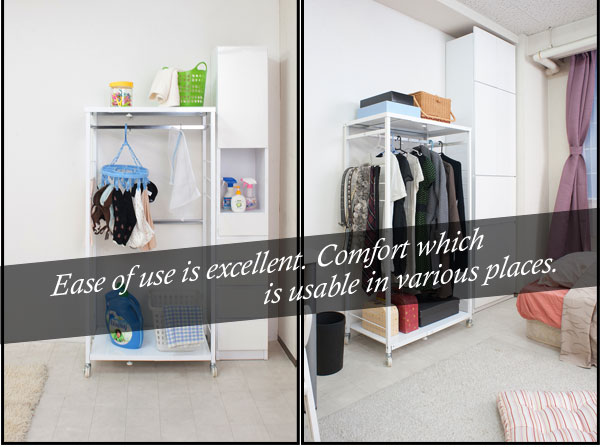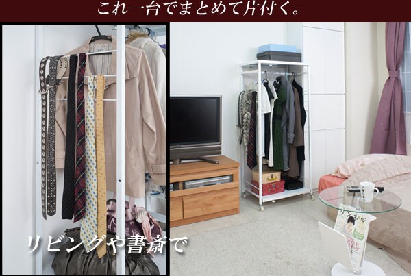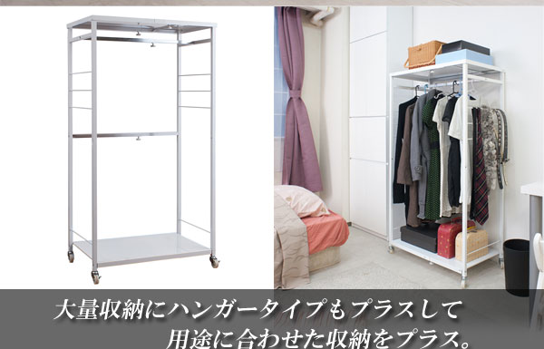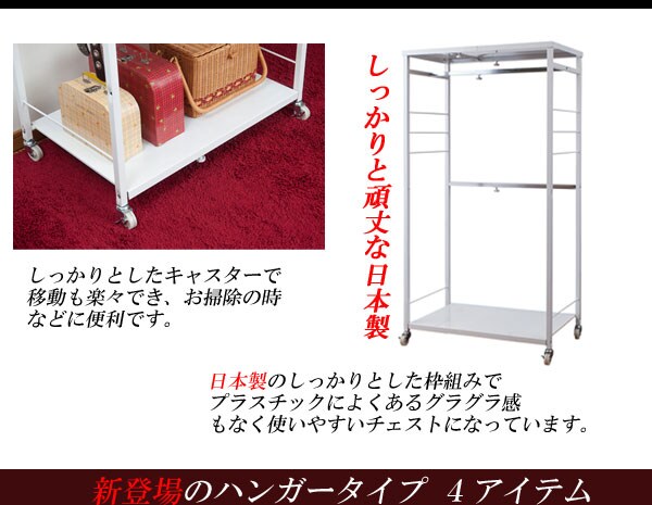 ■商品について/すっきりシンプルデザインでスチール製の頑丈なハンガーラックが新登場!スチールフレームで頑丈なつくり、それを支えるキャスターも大きめ頑丈で移動も楽々。ハンガーサイズは伸縮ができて置き場所や収納量によって自在にアレンジ可能。天板にはカバンなど服飾品いっさいがっさいしまえる多機能ハンガーラック。高さ2タイプから。同シリーズの多杯チェストと並べて大量収納で収納の達人に。安心・安全の日本製。