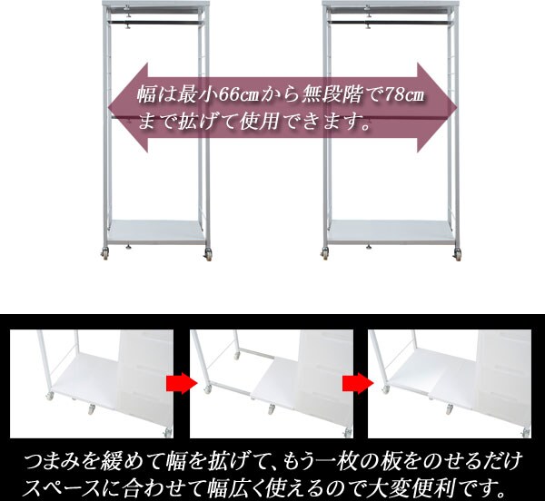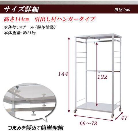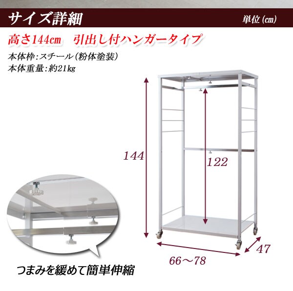●商品サイズ/本体:(約)幅66~78×奥行47×高さ144cm、ハンガー下高さ/122cm●耐荷重量/天板・棚板・ハンガー:約5kg