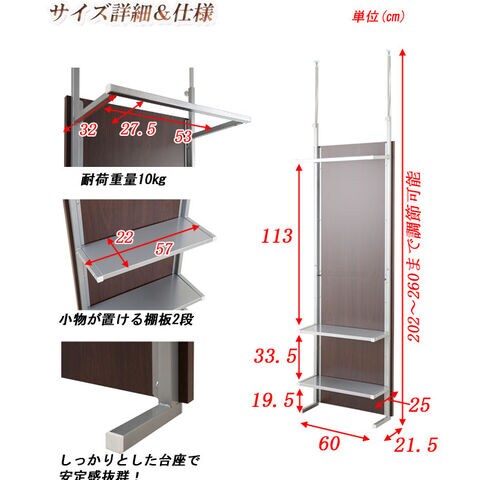 ■商品サイズ/本体:(約)幅60×奥行32(脚部21.5)×高さ202~260cm、棚板:(約)幅57×奥行22cm、棚間隔 :(約)33.5cm、ハンガー下高さ:(約)113cm、目隠し部高さ:(約)182cm
