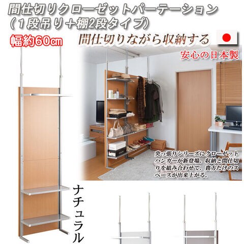 ■商品について/省スペースで圧迫感なく使用できる好評の間仕切りクローゼットパーテーションに収納に便利な棚2段付きが新登場。収納と間仕切りを組み合わせて、貴方だけのスペースが出来上がる。クローゼットハンガーだけを横並びにセットすればウォークインクローゼットが簡単にできます。またミラータイプやマガジンディスプレイタイプなどシリーズで組み合わせれば本格間仕切り部屋が完成します。ドアカーテンをセットすれば入り口も出来上がり。