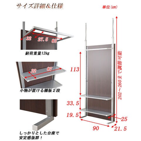 ■商品サイズ/本体:(約)幅90×奥行32(脚部21.5)×高さ202~260cm、棚板:(約)幅87×奥行22cm、棚間隔 :(約)33.5cm、ハンガー下高さ:(約)113cm、目隠し部高さ:(約)182cm