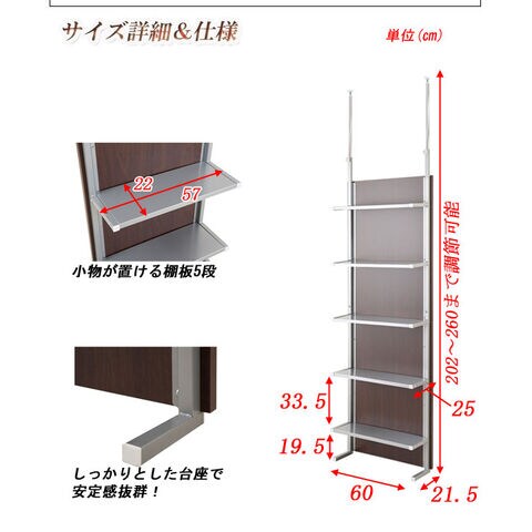 ■商品サイズ/本体:(約)幅60×奥行25(脚部21.5)×高さ202~260cm、棚板:(約)幅57×奥行22cm、棚間隔 :(約)33.5cm、目隠し部高さ:(約)182cm