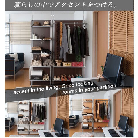 ■商品について/大好評の間仕切りパーテーションシリーズにディスプレイ収納に最適な棚5段付きが新登場。収納と間仕切りを組み合わせて、貴方だけのスペースが出来上がる。クローゼットハンガーと合わせて横並びにセットすればカバンなどもすっきり片付けられるウォークインクローゼットが簡単にできます。またミラータイプやマガジンディスプレイタイプなどシリーズで組み合わせれば本格間仕切り部屋が完成します。ドアカーテンをセットすれば入り口も出来上がり。