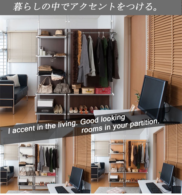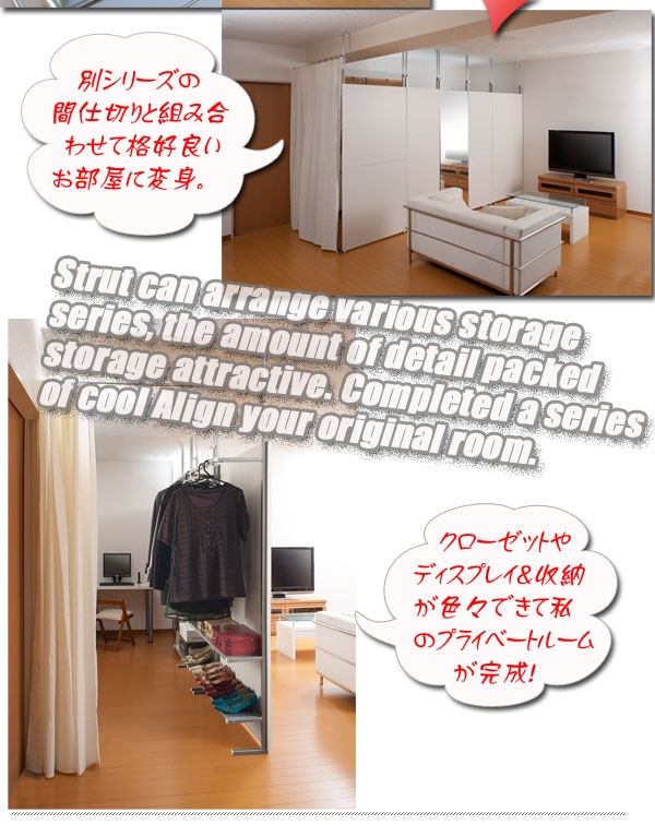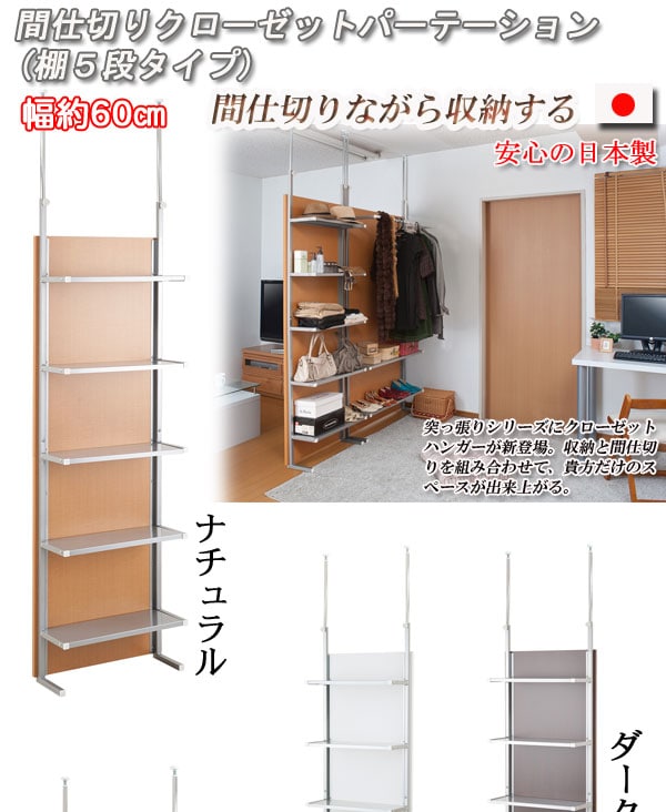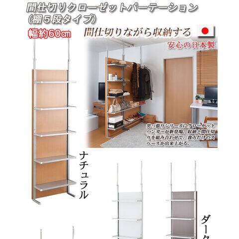 ■商品について/大好評の間仕切りパーテーションシリーズにディスプレイ収納に最適な棚5段付きが新登場。収納と間仕切りを組み合わせて、貴方だけのスペースが出来上がる。クローゼットハンガーと合わせて横並びにセットすればカバンなどもすっきり片付けられるウォークインクローゼットが簡単にできます。またミラータイプやマガジンディスプレイタイプなどシリーズで組み合わせれば本格間仕切り部屋が完成します。ドアカーテンをセットすれば入り口も出来上がり。