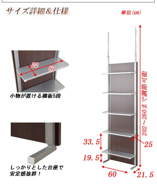 ■商品サイズ/本体:(約)幅60×奥行25(脚部21.5)×高さ202~260cm、棚板:(約)幅57×奥行22cm、棚間隔 :(約)33.5cm、目隠し部高さ:(約)182cm