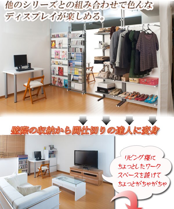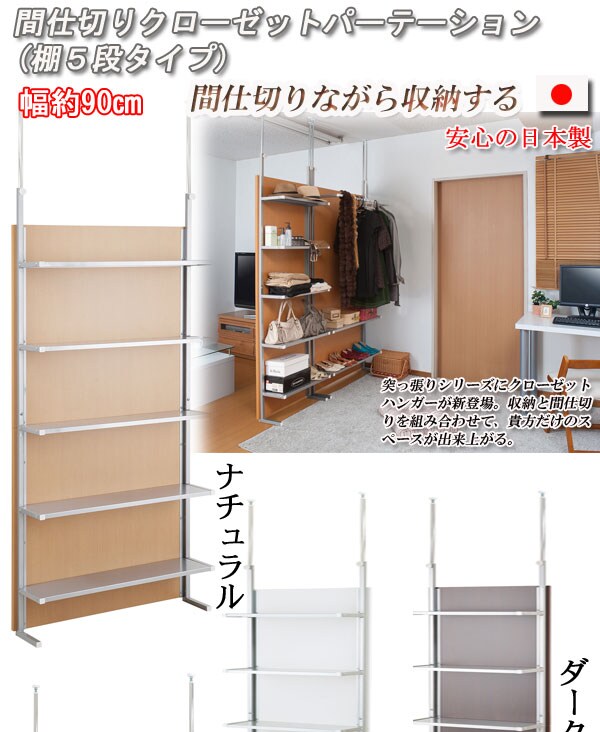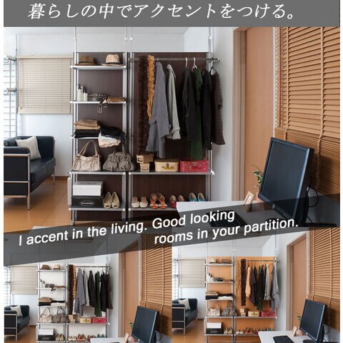 ■商品について/大好評の間仕切りパーテーションシリーズにディスプレイ収納に最適な棚5段付きが新登場。収納と間仕切りを組み合わせて、貴方だけのスペースが出来上がる。クローゼットハンガーと合わせて横並びにセットすればカバンなどもすっきり片付けられるウォークインクローゼットが簡単にできます。またミラータイプやマガジンディスプレイタイプなどシリーズで組み合わせれば本格間仕切り部屋が完成します。ドアカーテンをセットすれば入り口も出来上がり。