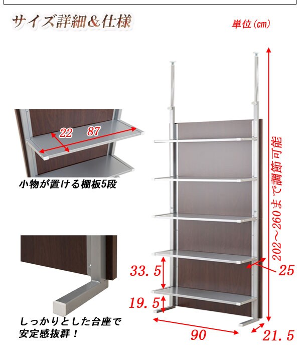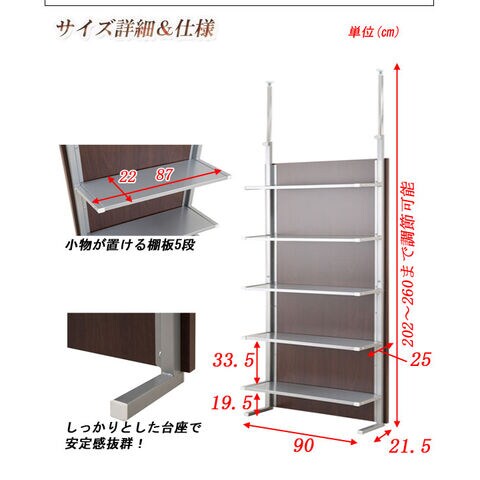 ■商品サイズ/本体:(約)幅90×奥行25(脚部21.5)×高さ202~260cm、棚板:(約)幅87×奥行22cm、棚間隔 :(約)33.5cm、目隠し部高さ:(約)182cm
