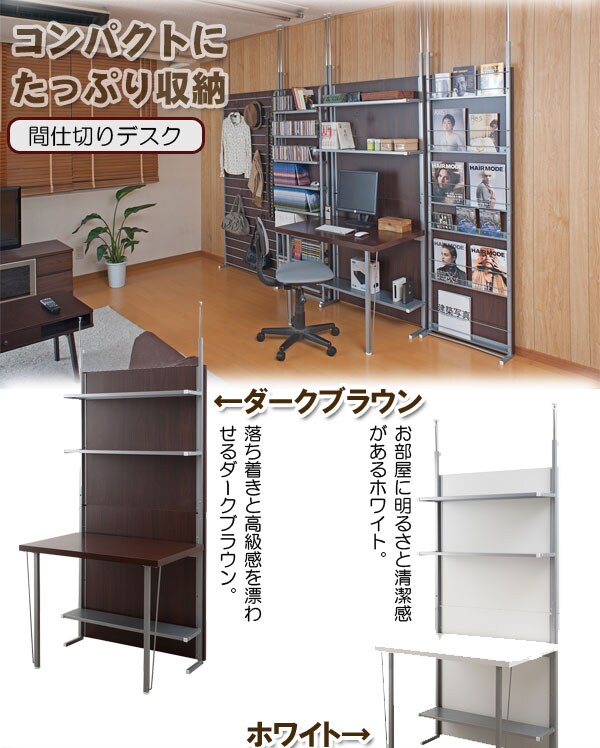 ■商品について/大好評の間仕切りパーテーションシリーズになんと!デスクが新登場。デスクにバックボードが付いて間仕切りとして使える、隠せる嬉しい多機能デスク。同シリーズの収納と間仕切りを組み合わせて、貴方だけのスペースが出来上がる。クローゼットハンガーと合わせて横並びにセットすればちょっとしたオフィス気分に。またミラータイプやマガジンディスプレイタイプなどシリーズで組み合わせれば本格間仕切り部屋が完成します。ドアカーテンをセットすれば入り口も出来上がり。