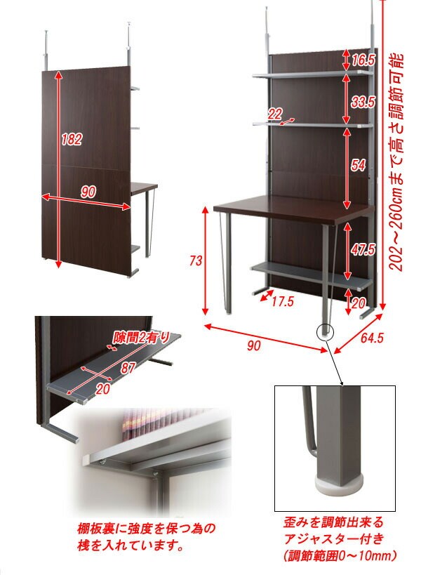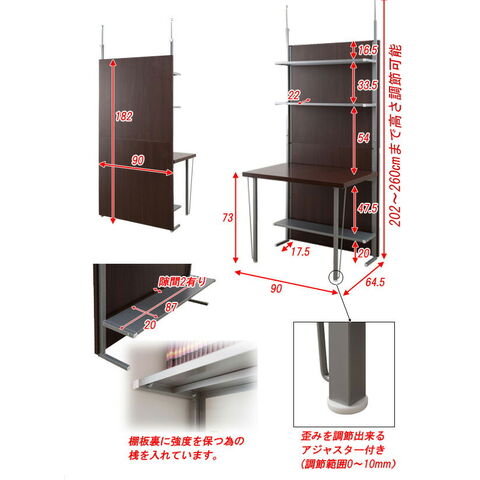 ■商品サイズ/本体:(約)幅90×奥行64.5(脚部17.5)×高さ202~260cm、棚板:(約)幅87×奥行22(最下段20)cm、棚間隔 :上棚~中棚(約)33.5、上棚~デスク面(約)54、デスク面~下棚(約)47.5cm、デスク面:(約)幅90×奥行60cm、デスク面高:床面より(約)73cm、目隠し部高さ:(約)182cm