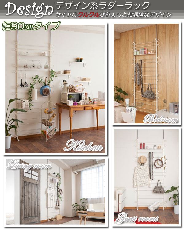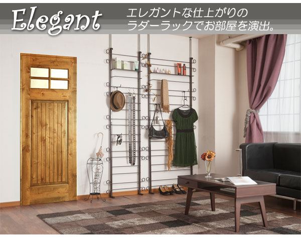 ■商品について/定番の無機質なスチール製ラダーラックに可愛らしいカーリーデザインを施したパーテーションが新登場。なんとなく,マンネリ化したインテリア...。ちょっとスパイスの利いた空間を造りたい...。簡単に雰囲気ある空間を演出できます。カントリーチックにもエレガントチックにも飾るものでテイストが変化!キッチンにも玄関にも置くだけでサマになるカーリーデザイン。上部にはハンガー+棚板で機能性も充実。フックもカーリーで2段使用が可能な細部までもこだわった多彩ラダー。幅60・90にカラーはホワイト・ブラウンの展開。
