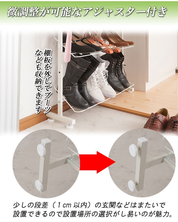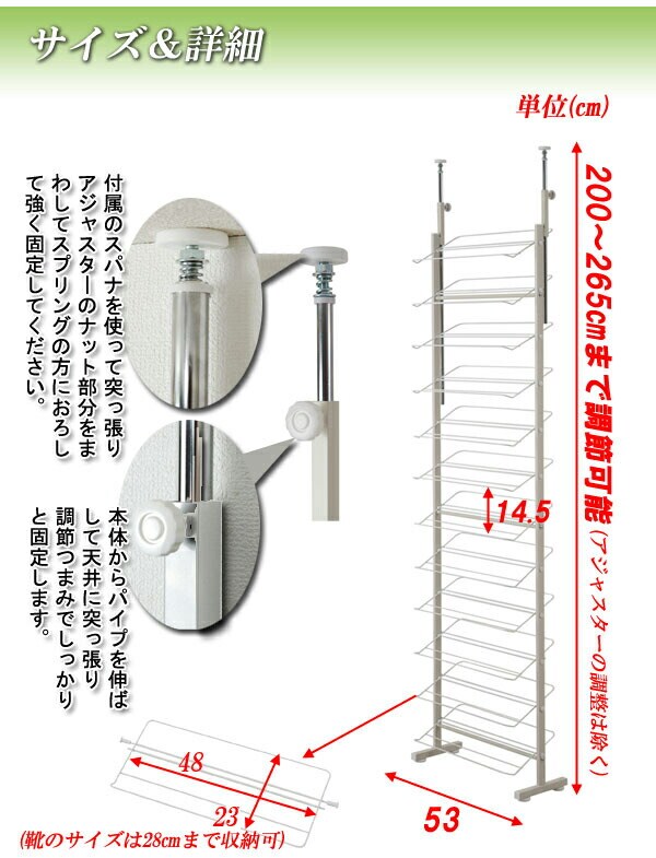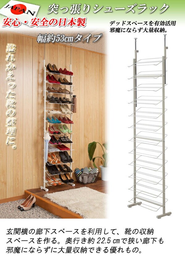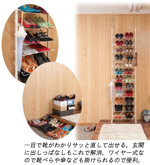■商品について/玄関に溢れている靴をしっかり、且つ大量収納でき、玄関のデッドスペースを有効活用できるシューズラックが登場!お気に入りの靴をおしゃれに飾ることで、毎日のお出かけが楽しくなること間違いなし!奥行が22.5cmと省スペース設計でデッドスペースに最適!更に12段あるので収納もしっかり!棚を斜めにすることで奥行をとらず、靴を取り出しやすく、見やすくおしゃれに収納できます。また、ワイヤー式なので靴べらや傘などをかけることができ、とても便利。低めの玄関框をまたいだ状態でも設置できるように微調整可能なアジャスターがついており、更に突っ張り式で安心。安全の日本製。幅29cm・53cm・75cmの3種類。玄関だけでなくお部屋にインテリアとしてもディスプレイ感覚でショップ風にキメる!