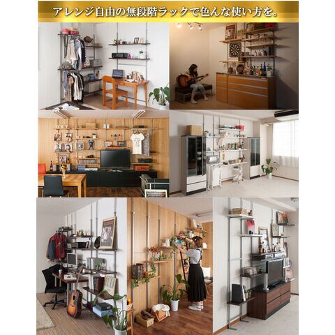 ■商品について/無段階に棚板の位置を調節できる突っ張りウォールシェルフが新たに登場!前回とは違い棚板の位置を無段階に調節できるから自分の丁度いい高さにすることができます!キッチンで食器や保存食を、リビングで雑誌やDVDを、ランドリーではバスタオルのストックや洗剤を置いたり。
