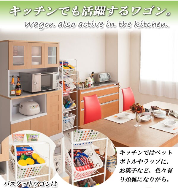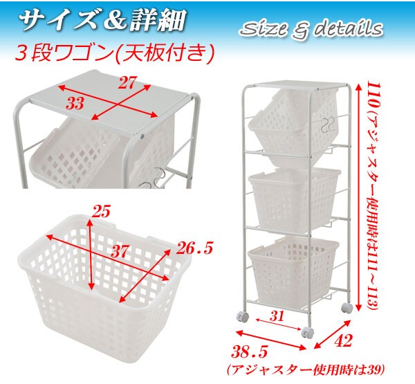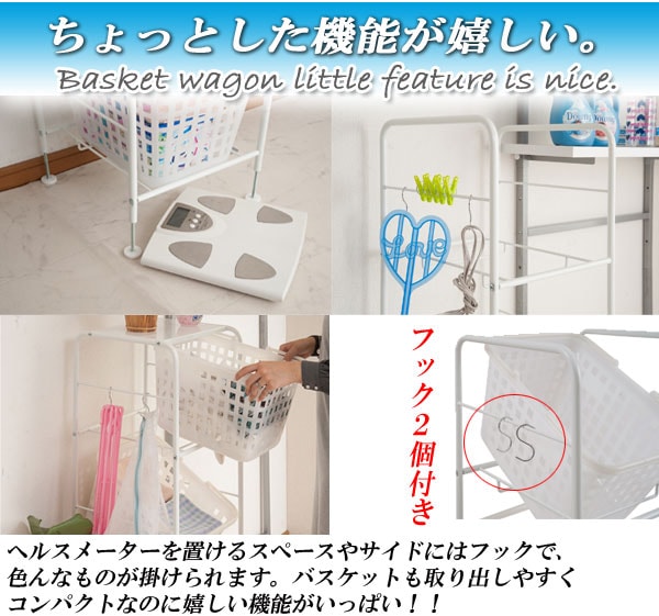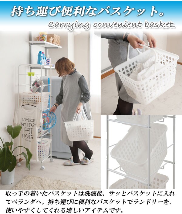 キャスター付きバスケットワゴン 3段天板付き ホワイト 脱衣所 収納 キャスター付 バスケット付 日本製【送料無料】