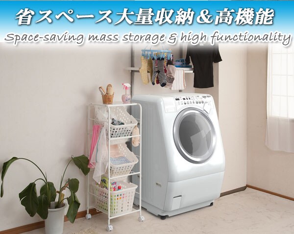 ■商品について/ランドリーで使うのに便利なワゴンが新しくなって新登場!使い易くするために、かごを斜めに設置した状態でも使用できるよう工夫しています。
