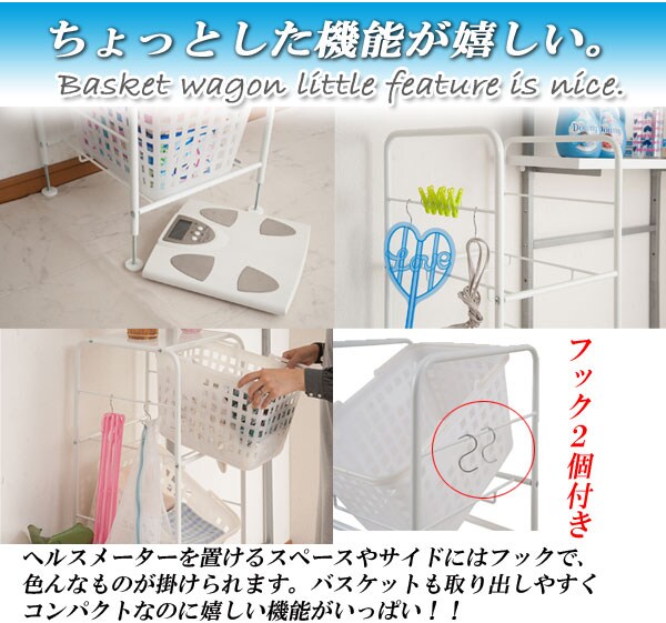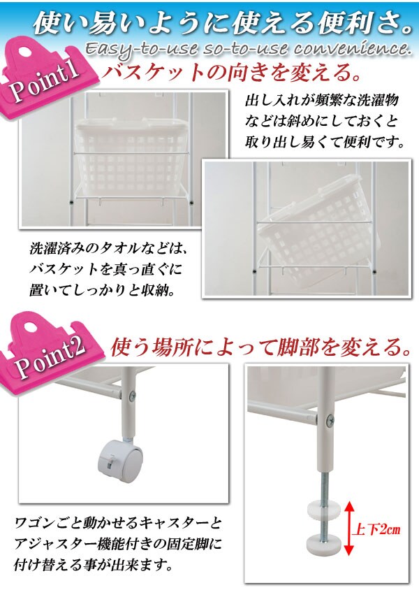 ■商品について/ランドリーで使うのに便利なワゴンが新しくなって新登場!使い易くするために、かごを斜めに設置した状態でも使用できるよう工夫しています。