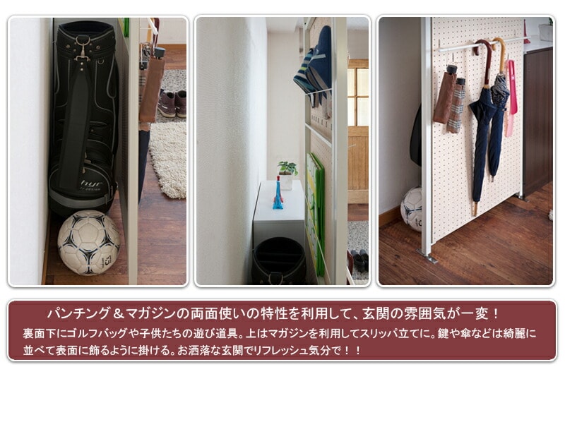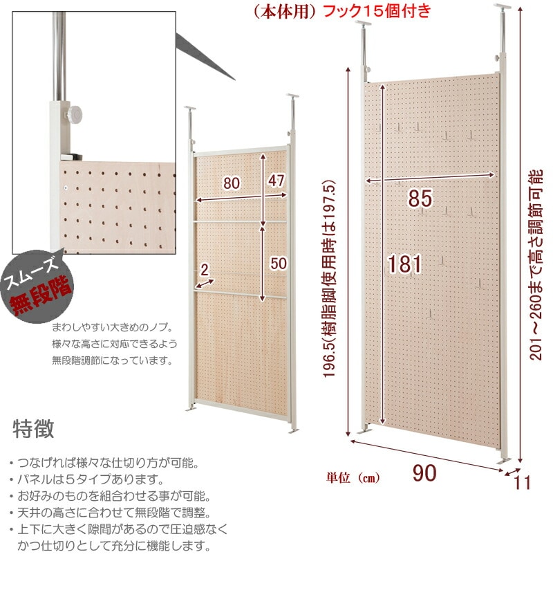 ■商品サイズ/本体:(約)幅90×奥行3(上下T字部11)×高さ201~260cm、目隠し部高さ(地面より)186cm、マガジンラック部:(約)幅80×奥行2×高さ(上)47(下)50cm、フック出幅(約)3.5cm