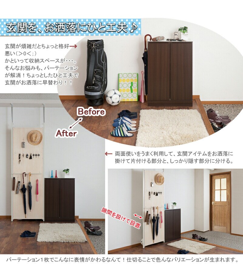 目隠し部分は清潔感際立つホワイト色、木目の温かみの落着きあるナチュラル色、モダンな印象のダークブラウン、完全にシャットアウトせずうっすら透ける半透明のお洒落な波状のポリカーボネイトに新タイプ有孔ボードが誕生!等間隔にならんだ穴が絶妙なディスプレイ創作を生みます。
