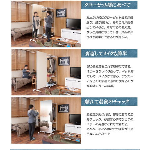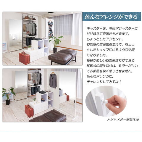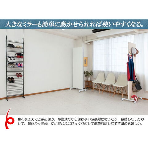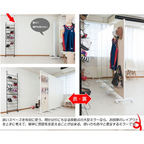 ■商品について/簡単に移動ができる大型ミラー。裏面も綺麗に仕上げて間仕切りにもなるのが嬉しい。ミラーは上部で連結できるので並べてワイドに使う事ができます。自宅が、ちょっとしたレッスンスタジオなどに早替わり。便利な移動式ミラーを、貴方の工夫次第で色んな用途で使用することができます。色んな工夫で上手に使う。移動式だから使わない時は間仕切ったり、目隠しにしたりして。見終わった後、使い終わればひっくり返して簡単に目隠しにできるのも嬉しい。