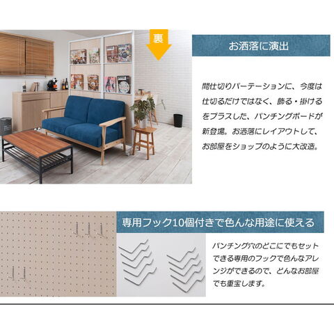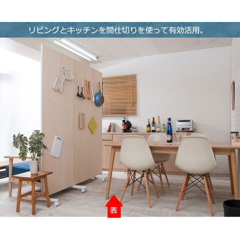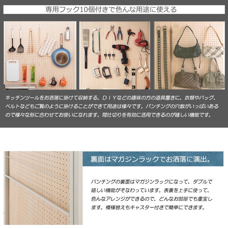 ■商品サイズ/本体:(約)幅60×奥行3(脚部43.5)×高さ(キャスター時189、アジャスター時184.5~185.5)cm、パネル高さ:(約)181cm、マガジンラック部:(約)幅55×奥行2×高さ(上)47(下)49.5cm、フック出幅(約)3.5cm