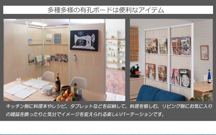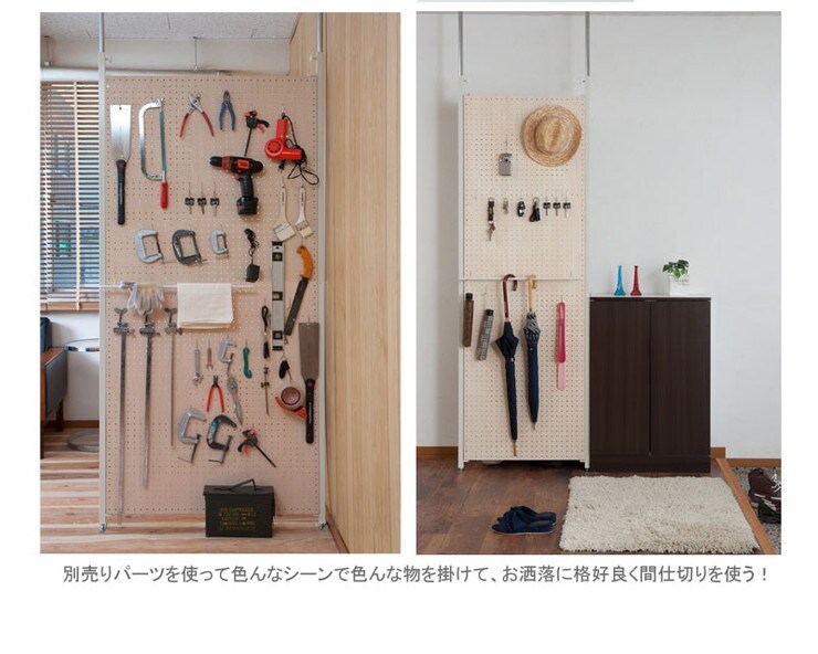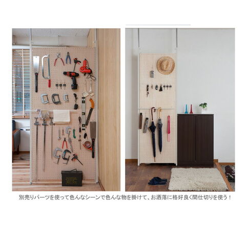 ■商品について/間仕切り有孔ボードタイプのキャスター付きパーテーション。好みの位置に衣類や帽子、カバンなどを掛けたり、裏面は雑誌の収納スタンド付き。ペグボードとしてツール収納にも。様々なシーンで活躍します。同シリーズのミラータイプやパネルタイプと組み合わせてダンススタジオや学校などの活動に。キャスター付きで移動がラクラクで重ねてしまっておける、使い勝手のよいパーテーションです。