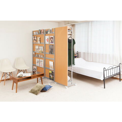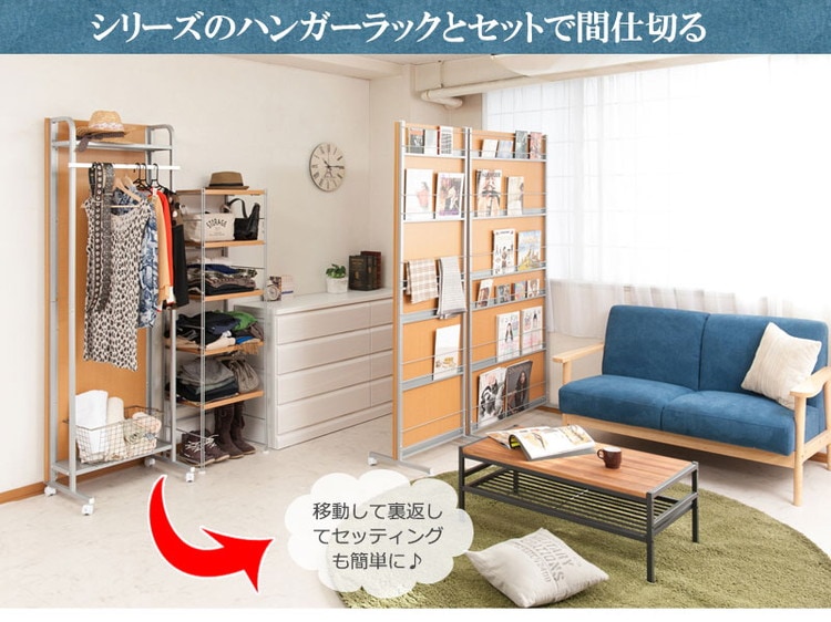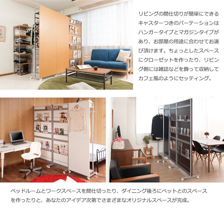 目隠し部分は清潔感際立つホワイト色、木目の温かみの落着きあるナチュラル色、モダンな印象のダークブラウン。キャスター付きでサッと移動ができて、奥行も薄型で圧迫感がありません。