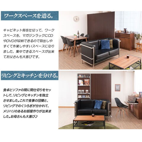 裏側がマガジンラック付きタイプ、棚付きハンガーラックタイプの2タイプ×3色展開。