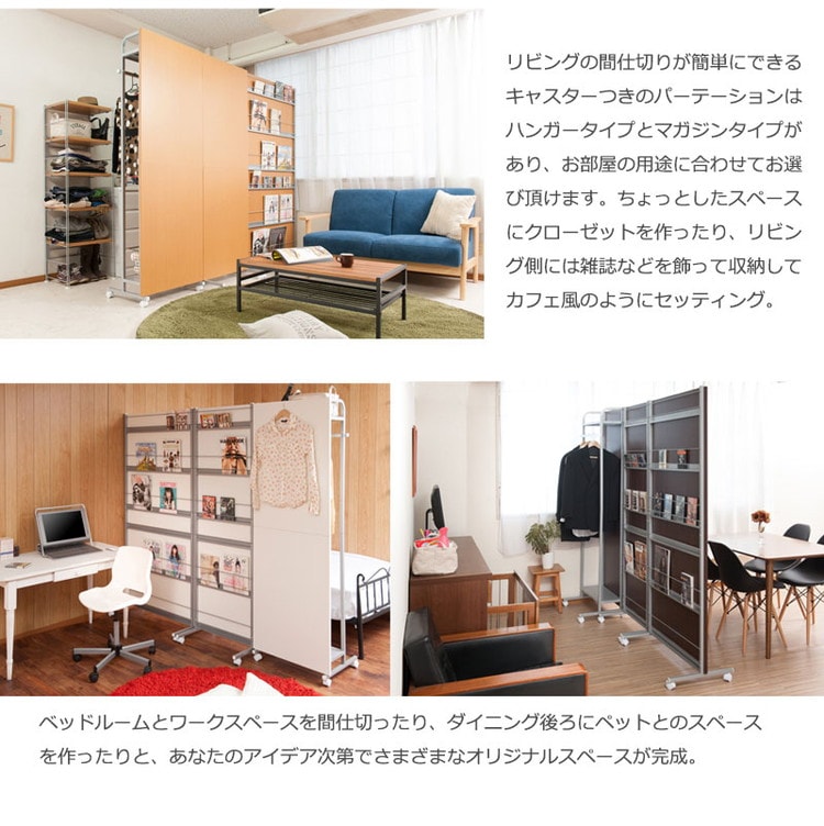 目隠し部分は清潔感際立つホワイト色、木目の温かみの落着きあるナチュラル色、モダンな印象のダークブラウン。キャスター付きでサッと移動ができて、奥行も薄型で圧迫感がありません。
