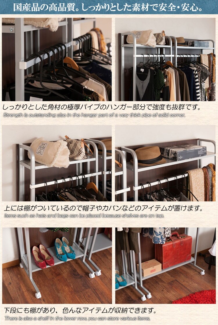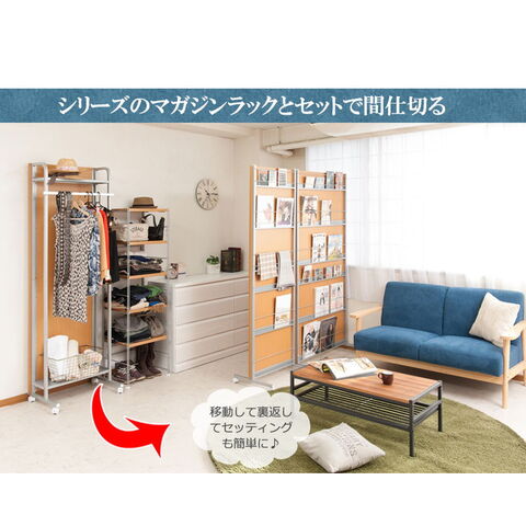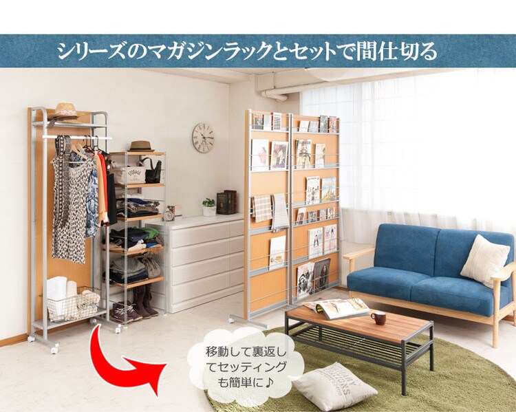裏側がマガジンラック付きタイプ、棚付きハンガーラックタイプの2タイプ×3色展開。