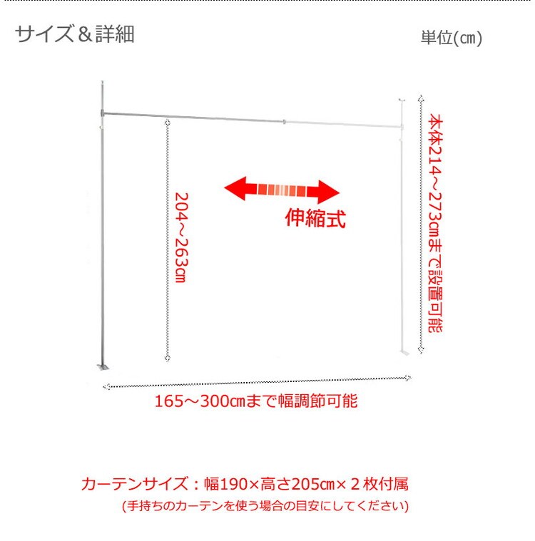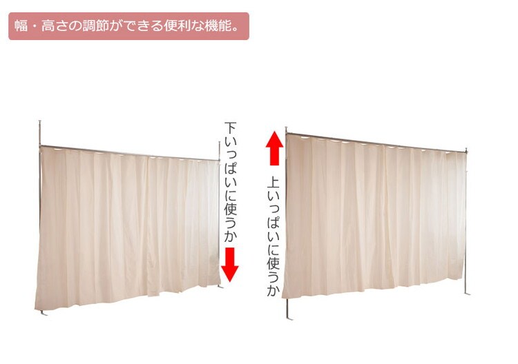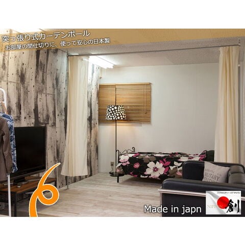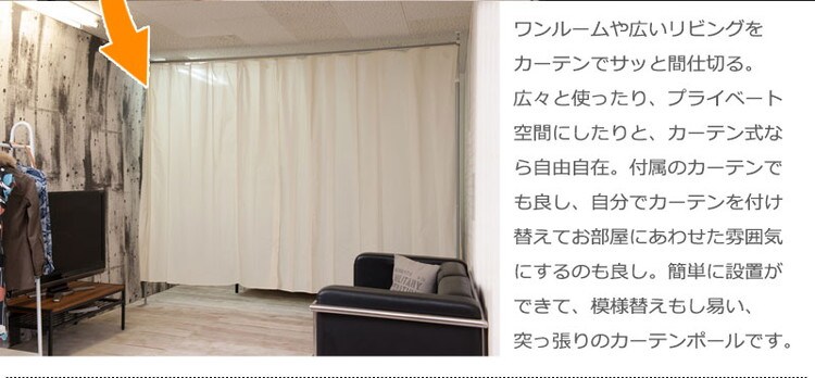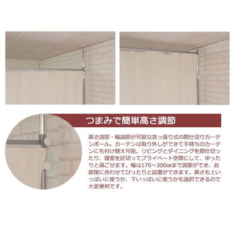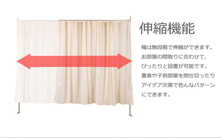 幅伸縮であらゆるシーンに対応。カーテンは取り外し可能で手持ちのカーテンに付け替えも可能な汎用性のあるカーテンポールです。