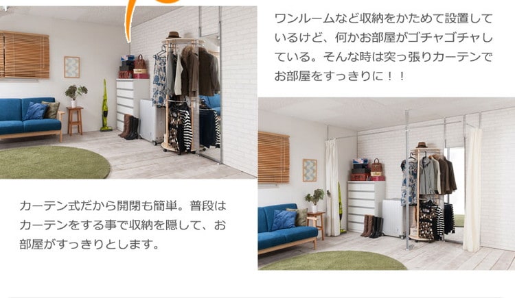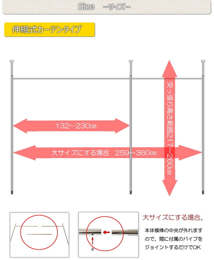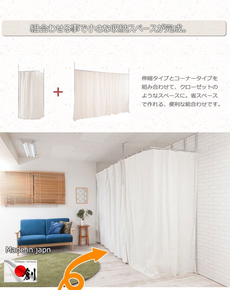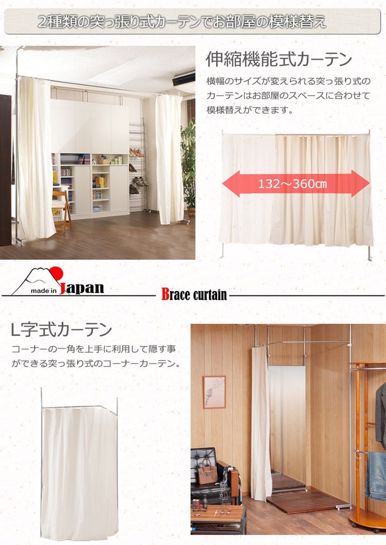 幅伸縮であらゆるシーンに対応。カーテンは取り外し可能で手持ちのカーテンに付け替えも可能な汎用性のあるカーテンポールです。
